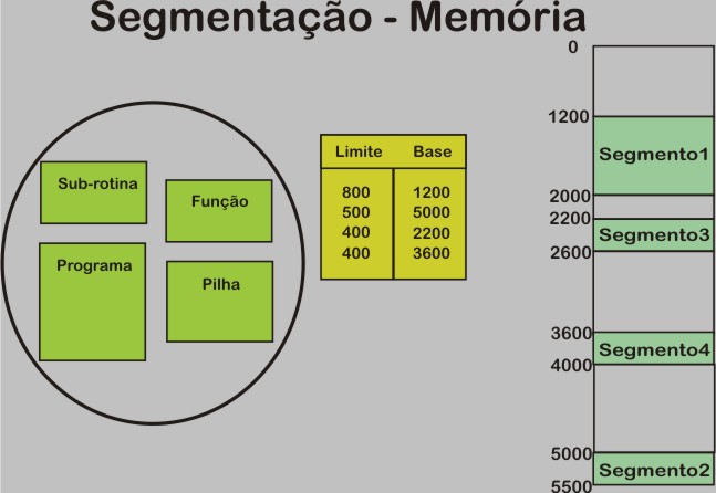 A segmentação tem como base a ideia de que na memória lógica temos uma tabela de segmentos, cujos endereços de base e de limite são o ínicio e o fim do segmento na memória física.